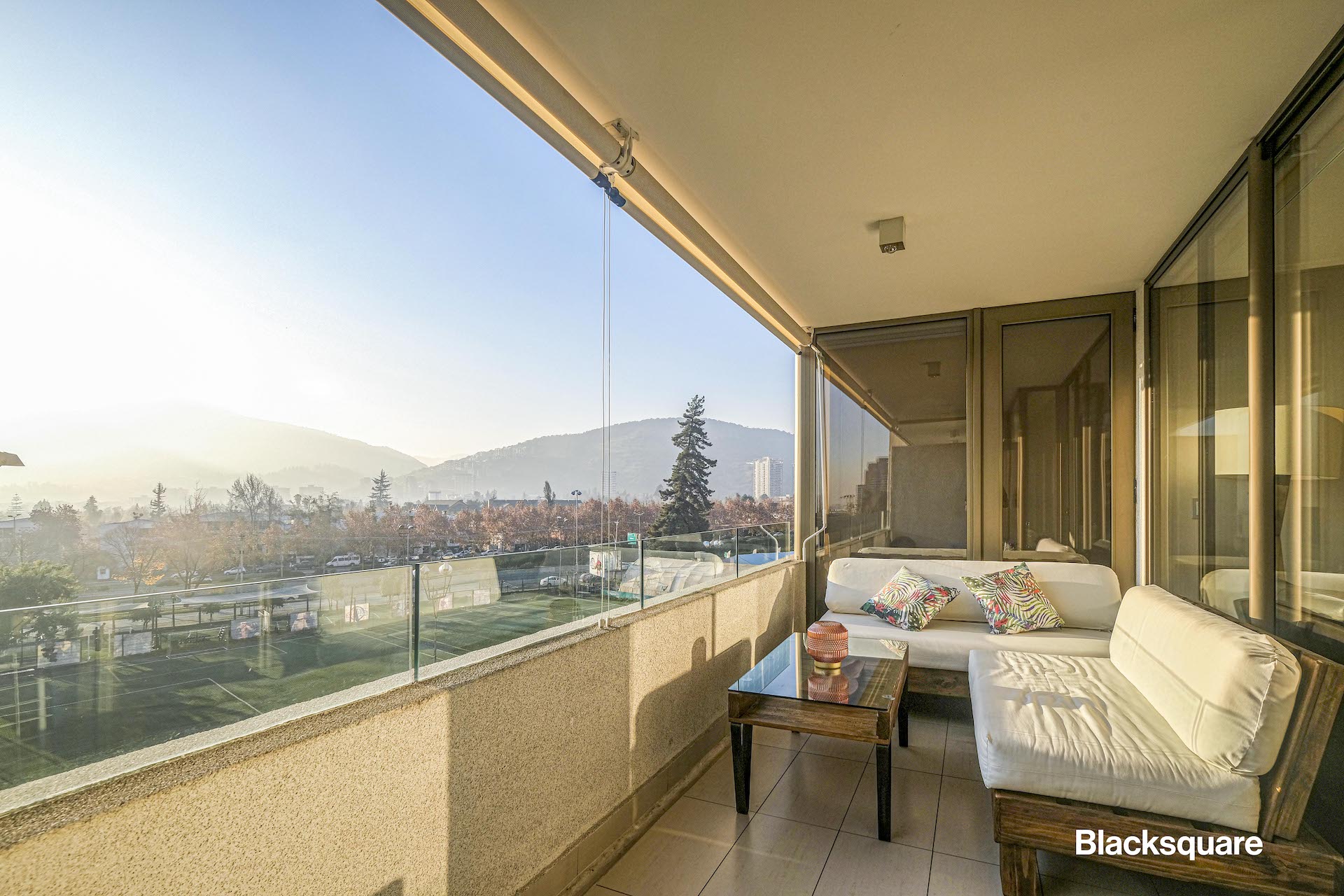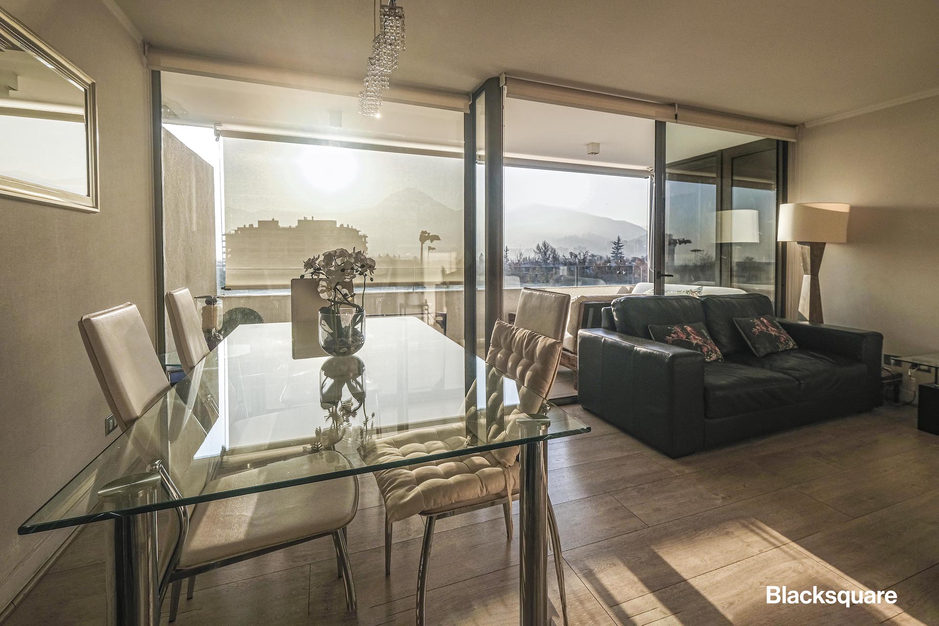 El amplio living comedor con cocina americana, cuenta con una espectacular vista norte despejada y asegurada. La que se puede gozar principalmente al atardecer mirando el cerro Manquehue.