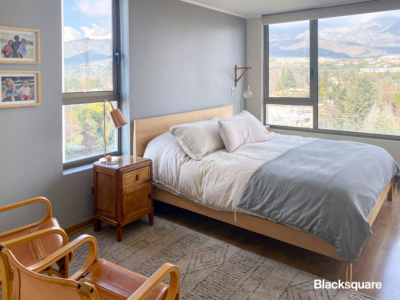 Hacia los dormitorios, nos encontramos con el principal, en suite, walk in closet y una espectacular vista hacia la cordillera, además tiene acceso a un terraza que comparte con los otros dos dormitorios, los cuales tienen la misma vista que la del dormitorio principal.
