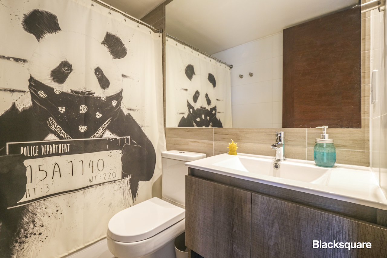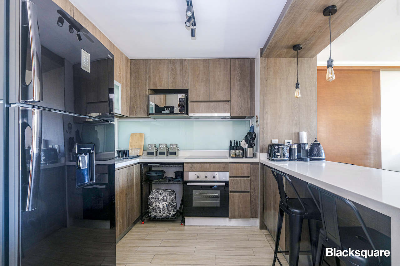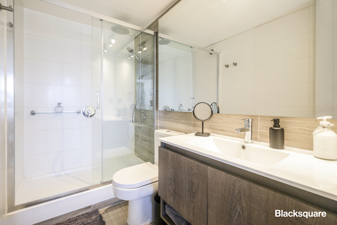 La cocina, con cubiertas de cuarzo y cocina vitrocerámica de 4 platos, tiene espacio para refrigerador de dos puertas, lavavajilla y lavadora.