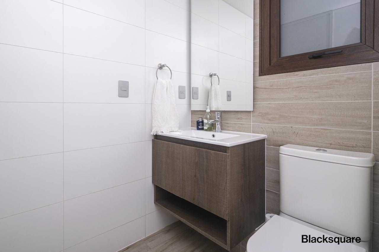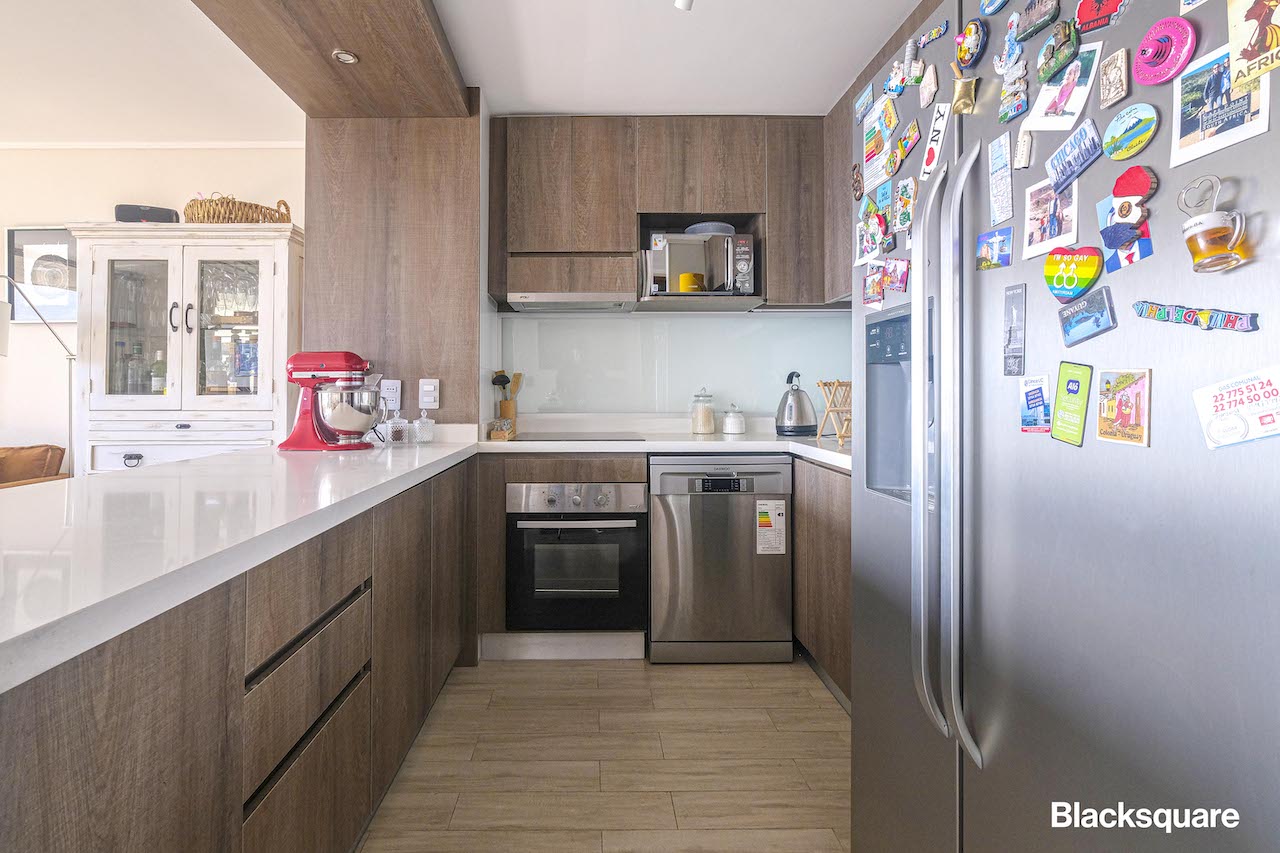 La cocina, con cubiertas de cuarzo y cocina vitrocerámica de 4 platos, tiene espacio para refrigerador de dos puertas, lavavajilla y lavadora.