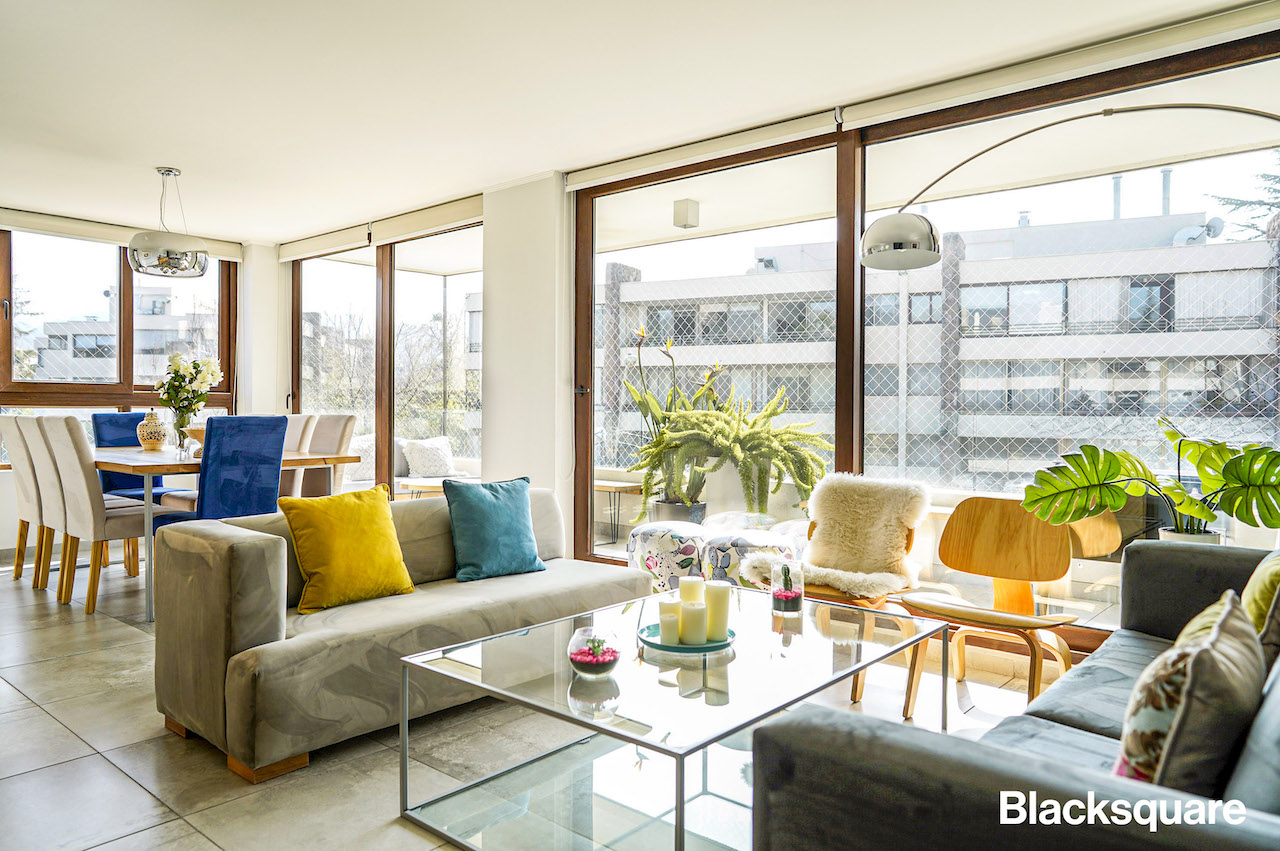 Extraordinario departamento seminuevo (2019), ubicado en el corazón de La Dehesa. A pasos del colegio Los Alerces, el centro comercial Portal La Dehesa, oficinas, todo tipo de servicios y a la Costanera Norte.