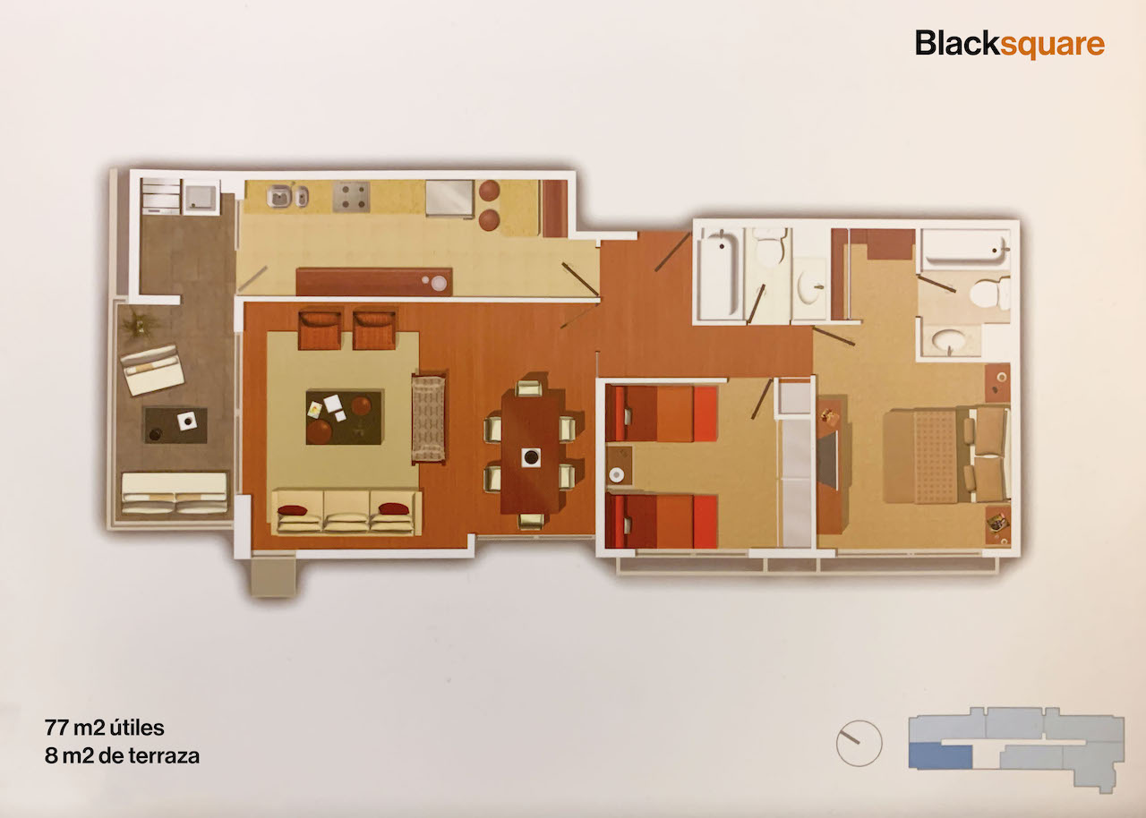 El departamento cuenta 2 dormitorios, el principal, en suite con walking closet. La cocina, con cubiertas de granito, tiene comeor de diario y logia.