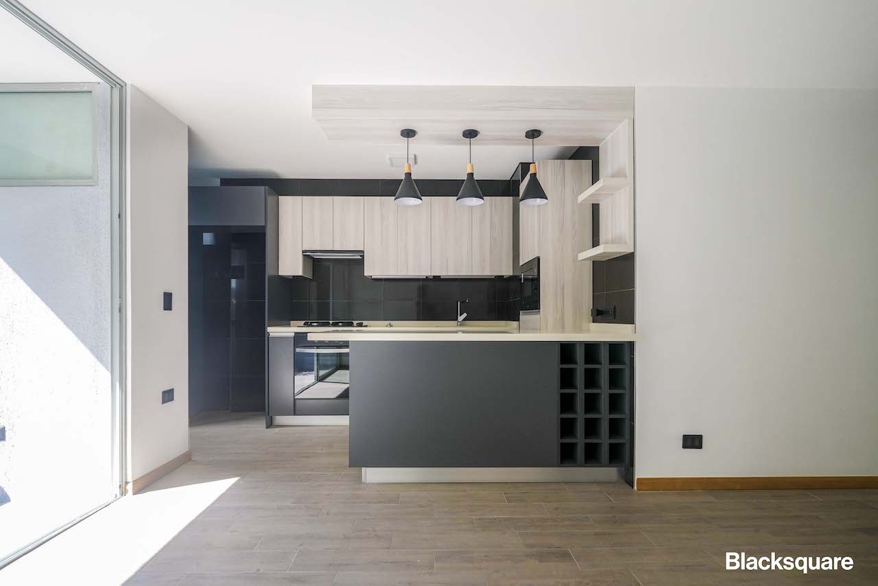 El departamento cuenta con un amplio living comedor con cocina americana, está última de gran amplitud y con equipamiento de última generación. Tiene conexión para lavadora y lavavajilla.