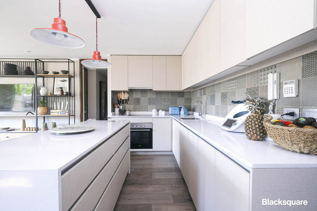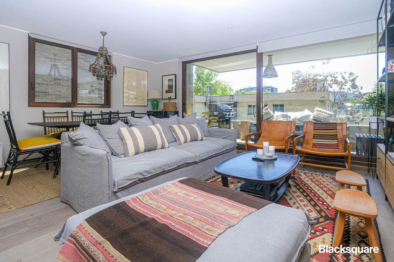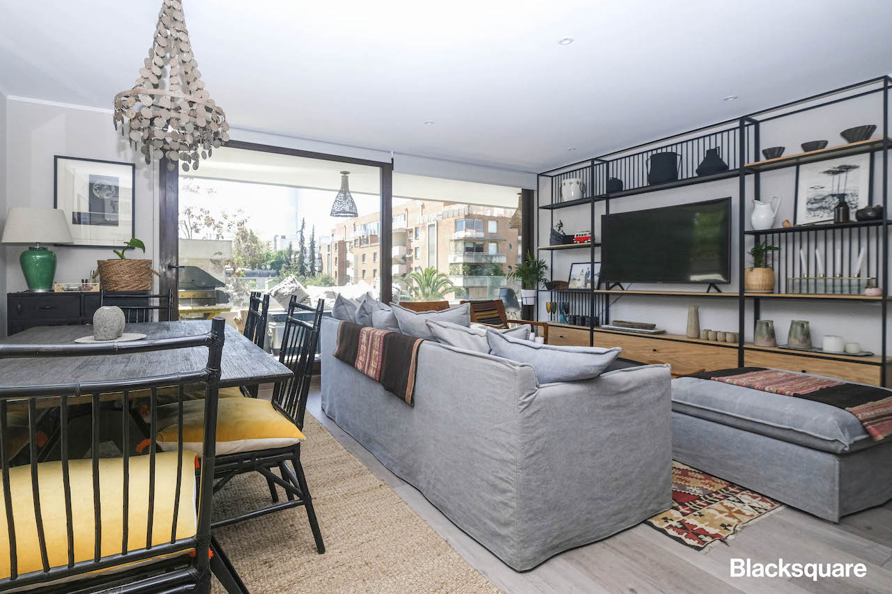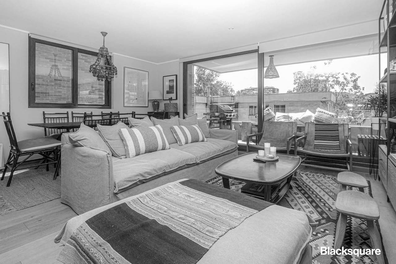 Se accede a un gran living comedor, el que tiene cocina americana, totalmente equipada, con terminaciones y equipamiento de última generación, tales como: cubiertas de cuarzo, encimera y horno eléctrico, lavavajilla y lavadora.