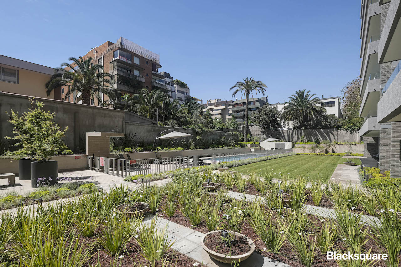 El edificio está equipado con gimnasio, salas de cowork y piscina con áreas verdes.