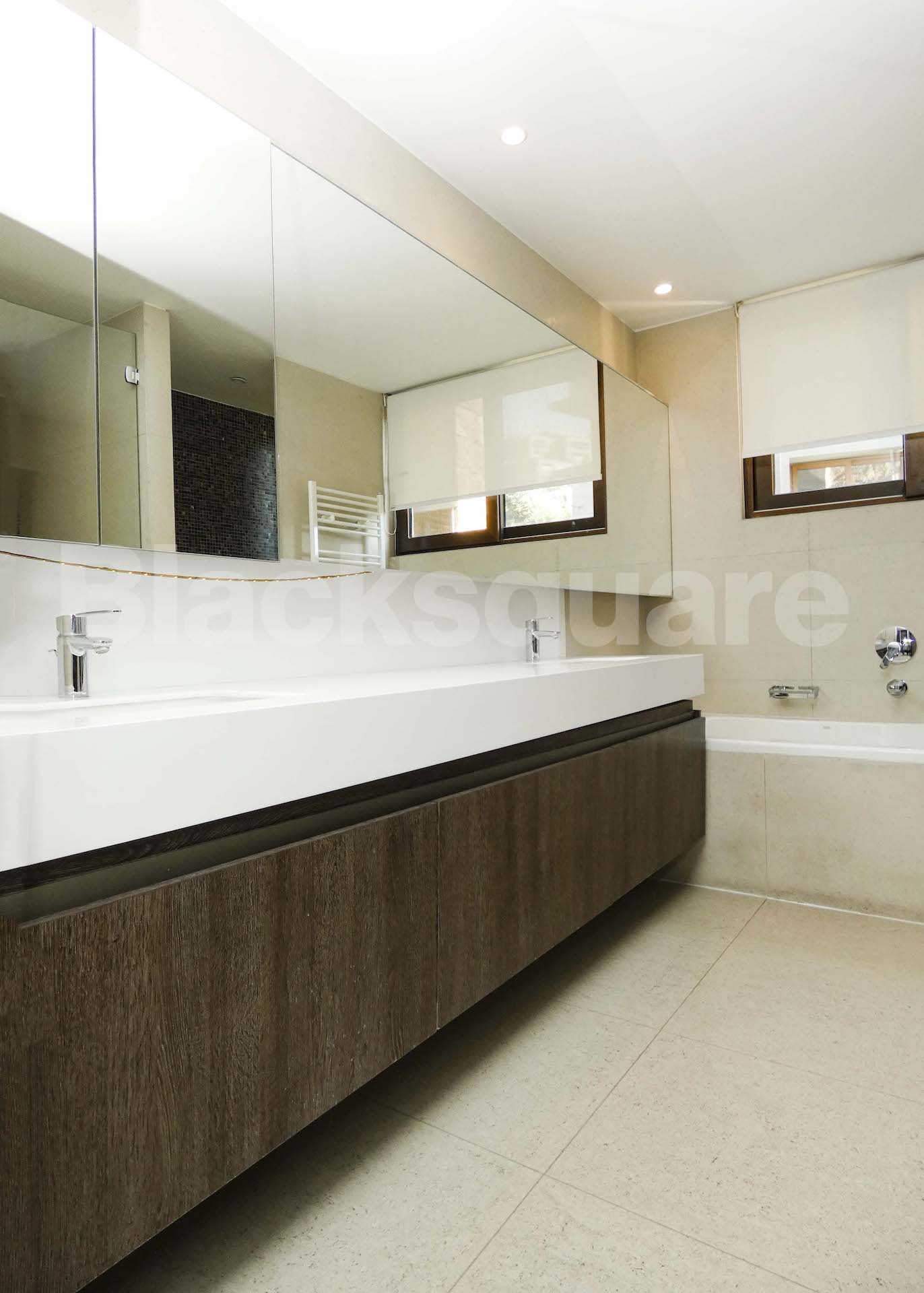 En cuanto a sus terminaciones, tiene piso flotante en living comedor, alfombra en dormitorios, porcelanato en terrazas y, cerámica en cocina y baños. Las ventanas son de termopanel con marcos de PVC y calefacción por losa radiante.